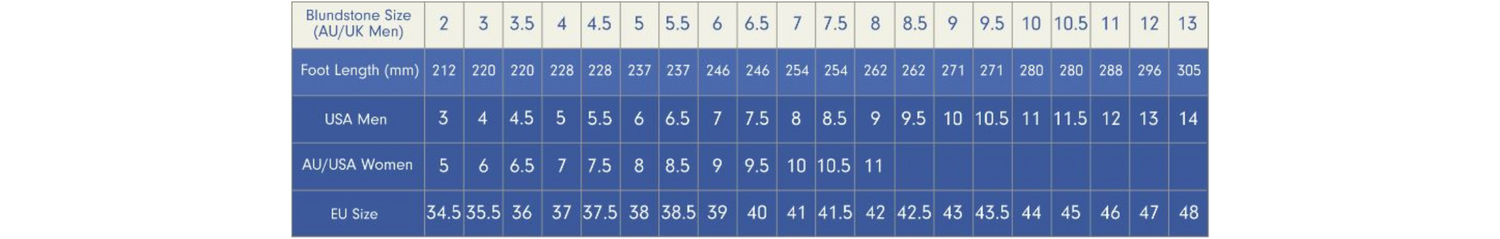All Blundstone lifestyle boots come in a AU/UK Mens size (Blundstone Size) - even our women’s heel and high-top boots.